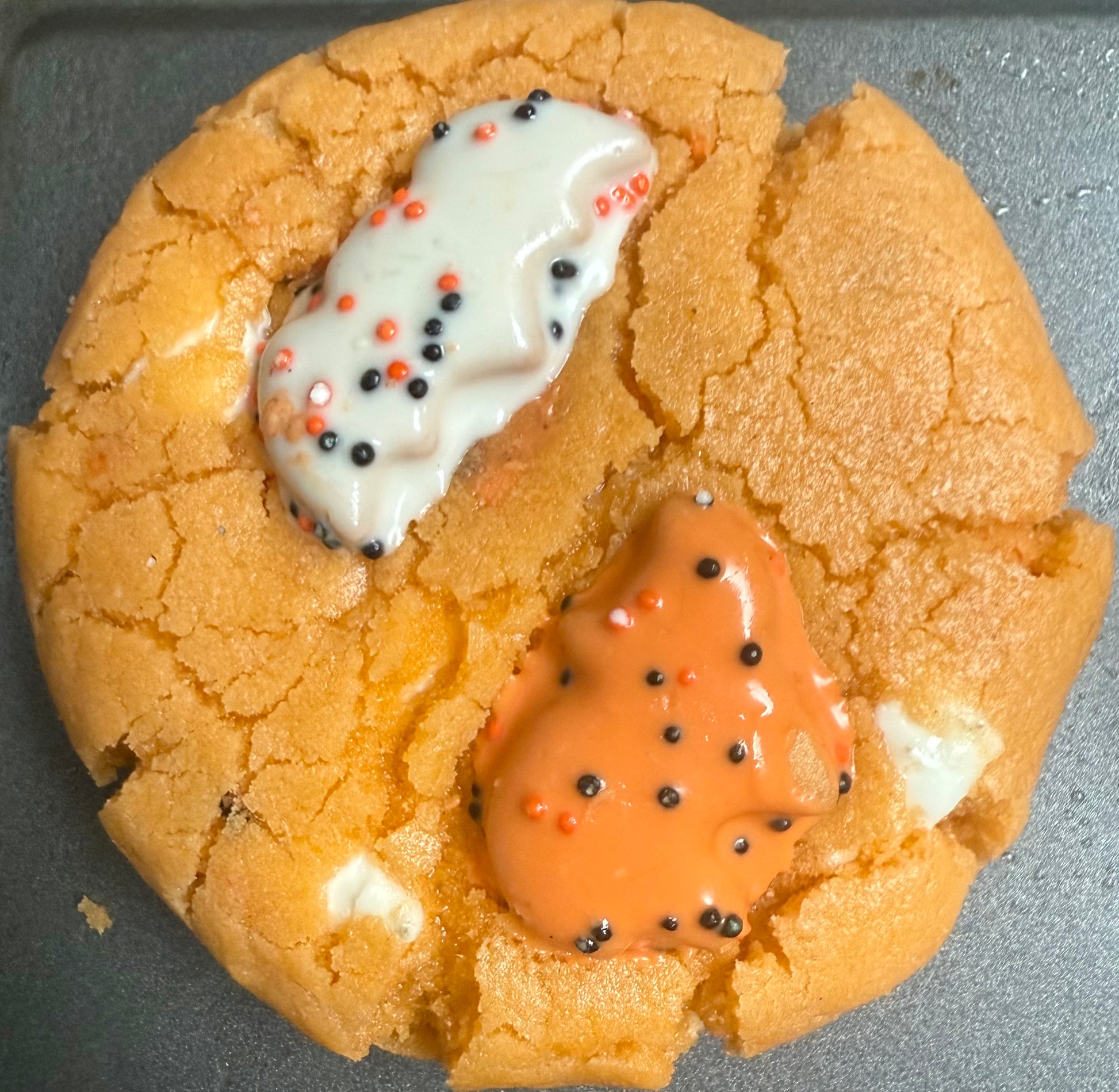 A Halloween twist on a nostalgic favorite! This cookie is packed with frosted animal cracker pieces, creamy white chocolate chips, and spooky Halloween sprinkles. Sweet, colorful, and it’s a scary-good treat for your spooky cravings!